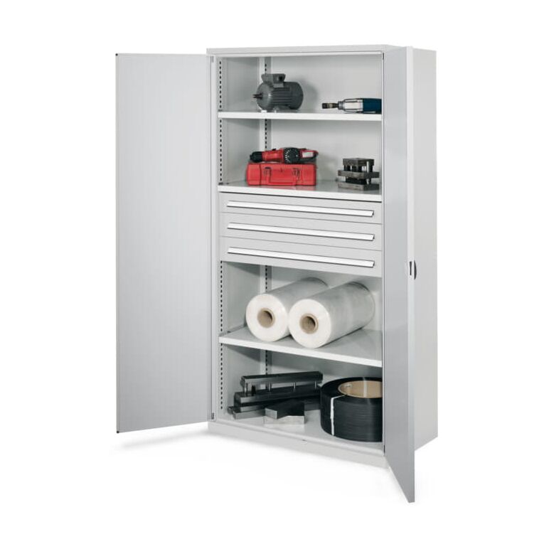 Schwerlastschrank ohne Mitteltrennwand, 1950 x 1000 x 600 mm, Modell 43, RAL 7035 | Doppelwandtür | 3 Fachböden verzinkt, 1 Schublade RAL 7035 H100 2 Schubladen RAL 7035 125