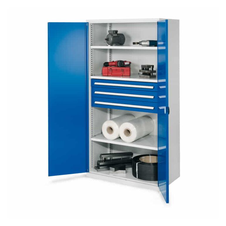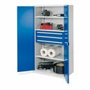 Kappes Schwerlastschrank ohne Mitteltrennwand, 1950 x 1000 x 600 mm, Modell 43, RAL 7035/5010 | Doppelwandtür | 3 Fachböden verzinkt, 1 Schublade RAL 7035 H100 2 Schubladen RAL 7035 126