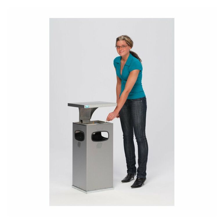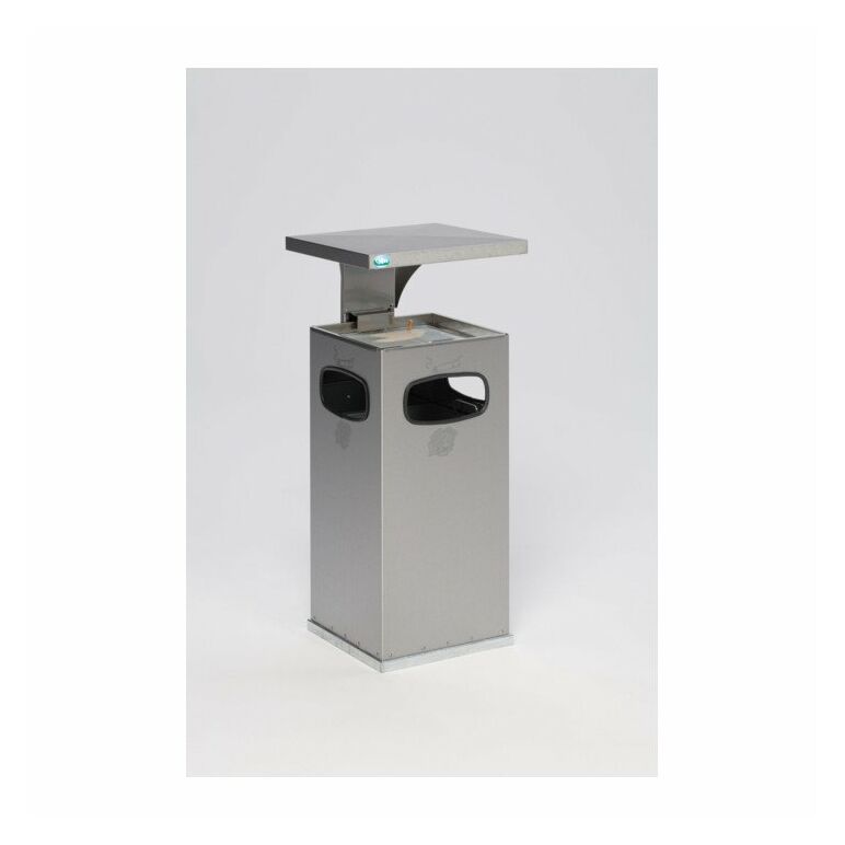 - Das verstärkte Dach wird mit einem Schloss (Vierkant-Schlüssel) verriegelt und ist gleichzeitig Diebstahlsicherung für den Aschereinsatz (Edelstahl) und das Kippensieb