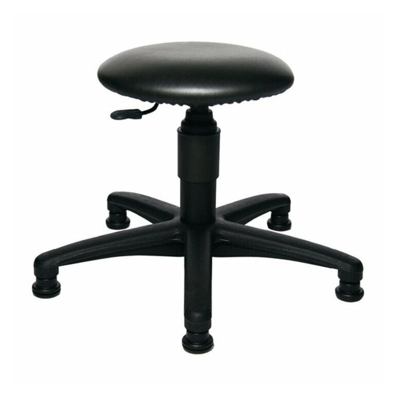 Sitz mit bequemem Kunstlederpolster Ø 360 mm · stabiles, kippsicheres Fünffuß-Kunststoff-Fußkreuz, Farbe schwarz · Sitzhöhenverstellung mit Sicherheitsgasfeder · Untergestell mit Fußgleitern