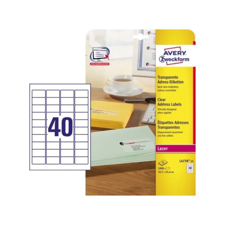 Geben Sie Ihren Aussendungen eine professionelle Note. Transparente Adress-Etiketten von Avery Zweckform helfen Ihnen dabei! Die Folienetiketten sind nach dem Aufkleben nahezu unsichtbar. Dank der kostenlosen Avery Zweckform Vorlagen und Software-Lösungen können Sie die Etiketten schnell und einfach gestalten und drucken!