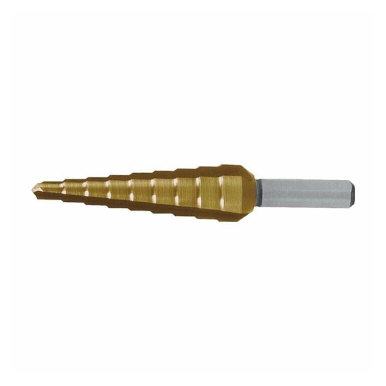 HSS · CBN-geschliffen · mit 3 Schneiden · Spitzenwinkel 118 ° · Stufenwinkel 90 ° · Schaft mit 3 Spannflächen Die tiefengeschliffenen Spannuten bei Stufenbohrern mit 3 Schneiden gewährleisten ein absolut ratterfreies Arbeiten. Durch die geringe Schneidenbelastung ist ein höherer Vorschub insbesondere bei weichen Materialien wie NE-Metalle möglich. Der Konus erleichtert das Zurückziehen bei durchgebohrten Blechen. Weitere technische Eigenschaften: · Spitzenwinkel: 118° · Stufenwinkel: 90° · Nut: geradegenutet · Ø: 4/ 6/ 8/ 10/ 12/ 14/ 16/ 18/ 20mm · Schneidenanzahl: 3 · Schneidstoff: HSS