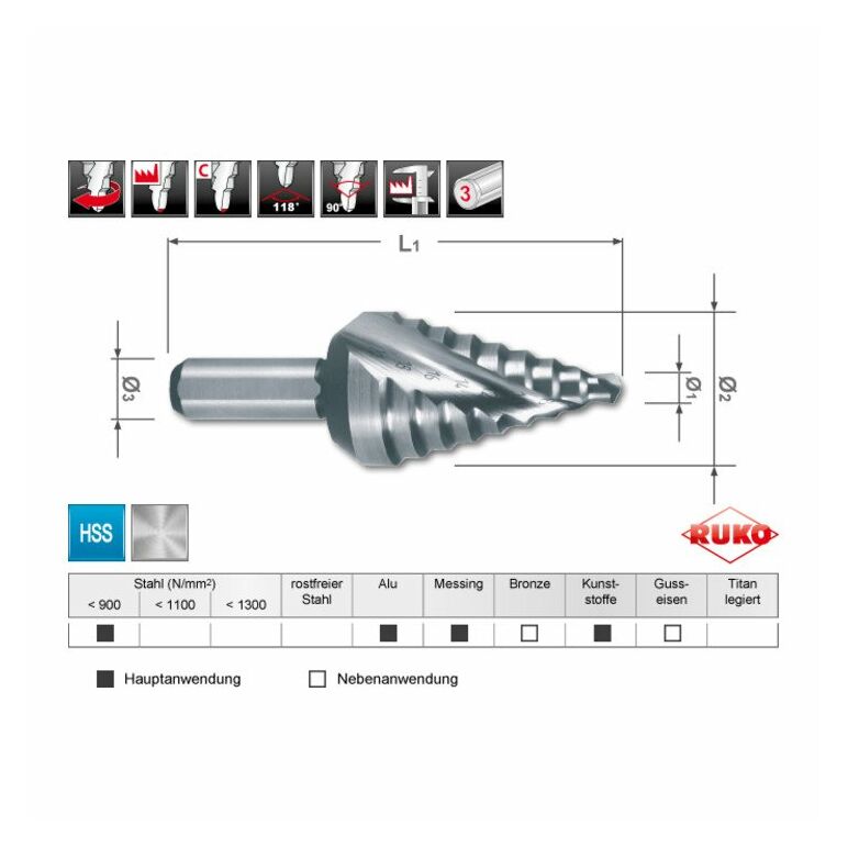 RUKO Stufenbohrer Bohrber.4-20mm HSS Spiralnut