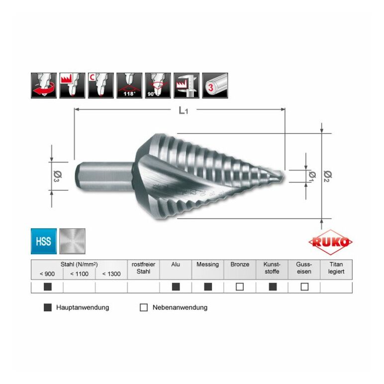 - HSS: Hochleistungs-Schnellarbeitsstahl für Bohrungen in gut bearbeitbare Materialien mit einer Festigkeit von bis zu 900 N/mm²