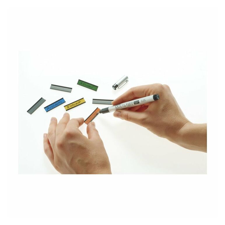 - Die perforierten Etiketten zum Auflegen auf U-Profile lassen sich mit Kugel- oder Filzschreiber, oder aber mit Beschriftungsgerät beschriften