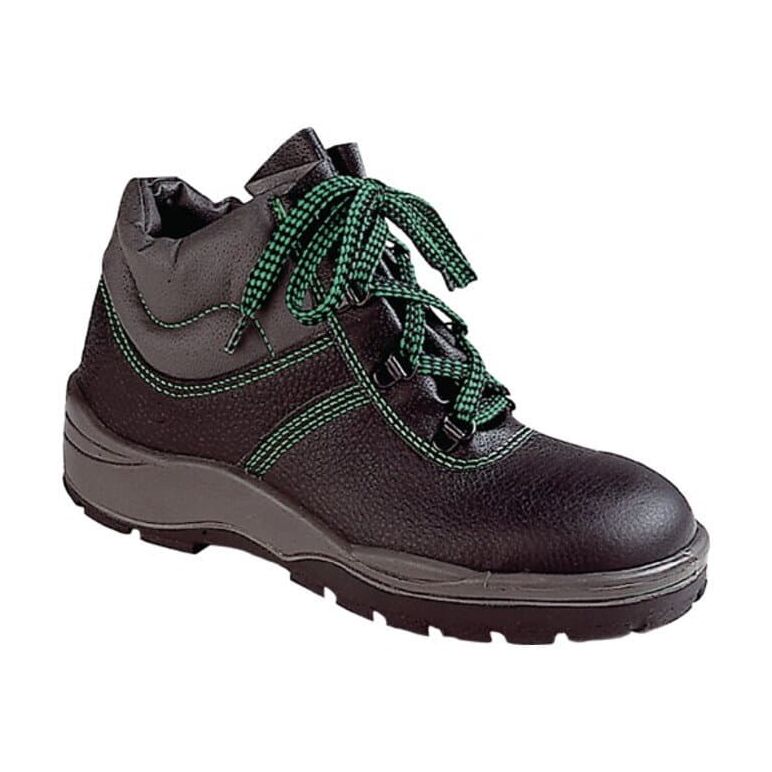 nach DIN EN ISO 20345:2011 · S3 SRA · Obermaterial: Schaft aus schwarz/grauem Rindnarbenleder, wasserabweisend · grüne Kontrastnähte · Knöchel-, Schaftrand- und Laschenpolster · Stahlkappe · Stahlzwischensohle · Innensohle durchgehend und ergonomisch geformt · rutschhemmende 2-Schichten-PUR-Laufsohle · antistatisch · öl- und säurebeständig · Weite 10 Weitere technische Eigenschaften: · Zehenschutzkappe: Stahl · Zwischensohle: Stahl · Norm: EN ISO 20345