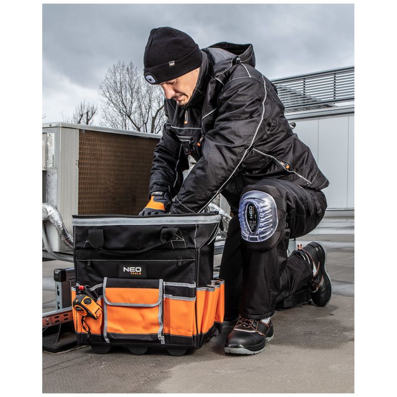 Die mobile Werkzeugkiste ermöglicht den Transport langer Elektrowerkzeuge wie Hammerhämmer, Winkelschleifer oder Betonmischer mit dem nötigen Zubehör. Sie ist mit drei verstellbaren Fächern ausgestattet – darunter ein Multi-Fach, das dank der differenzierten Halterungen für Handwerkszeug für Ordnung im Inneren der Box sorgt. Seine überdurchschnittlichen Abmessungen machen es zu einem einzigartigen Produkt in seiner Kategorie.