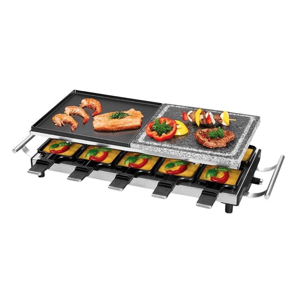 Die Firma ProfiCook bietet hier mit dem PC-RG 1144 einen 2 in 1 Raclette Grill für bis zu 10 Personen. Der Raclette Grill verfügt über 2 verschiedene Grillplatten. Hierbei handelt es sich um einen Naturgrillstein zum fettarmen und gesunden Grillen von Gemüse und eine Wendegussplatte zum Grillen von Fisch oder Fleisch. Mithilfe des stufenlos regelbaren Thermostats kann man die gewünschte Temperatur ganz an seine Bedürfnisse anpassen. Die Grillplatte und die Pfännchen sind alle antihaftbeschichtet, was eine einfache Reinigung ermöglicht. ProfiCook ist eine Marke der Clatronic International GmbH und ist ein Hersteller für Küchenwerkzeuge, der sich durch lange Tradition und hohe Verarbeitungsqualität auszeichnet.