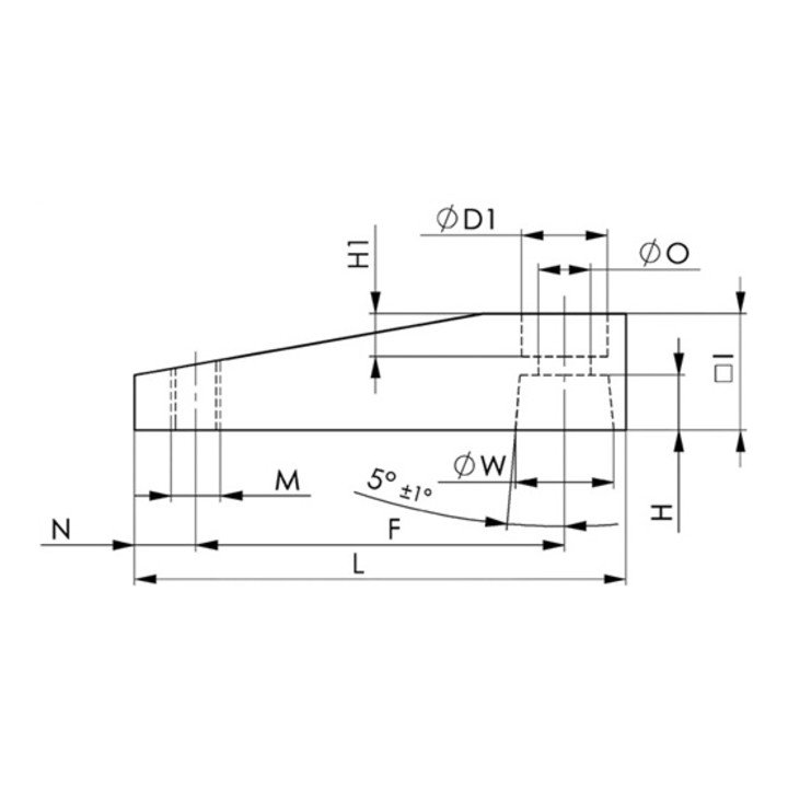 Maß H: Abhängig von Nutentiefe nach DIN 650, sowie Einschraublänge der Mutter. Die niedrigste Spannhöhe wird durch Umdrehen des Spanneisens erreicht. Spanneisen ohne Spannschraube sind in den Größen 12 und 14, 16 und 18 sowie 20 und 22 je eine Größe.