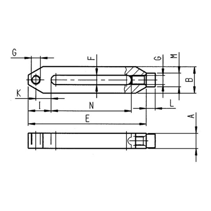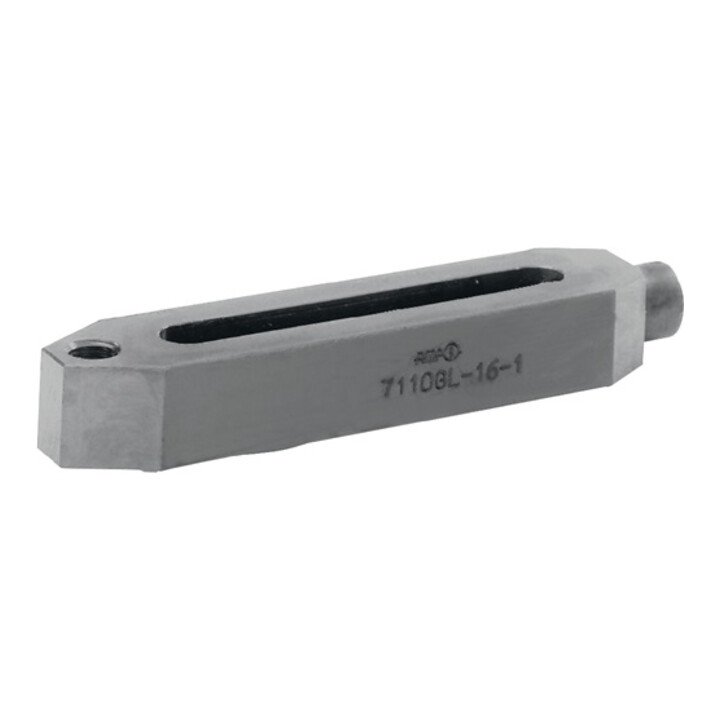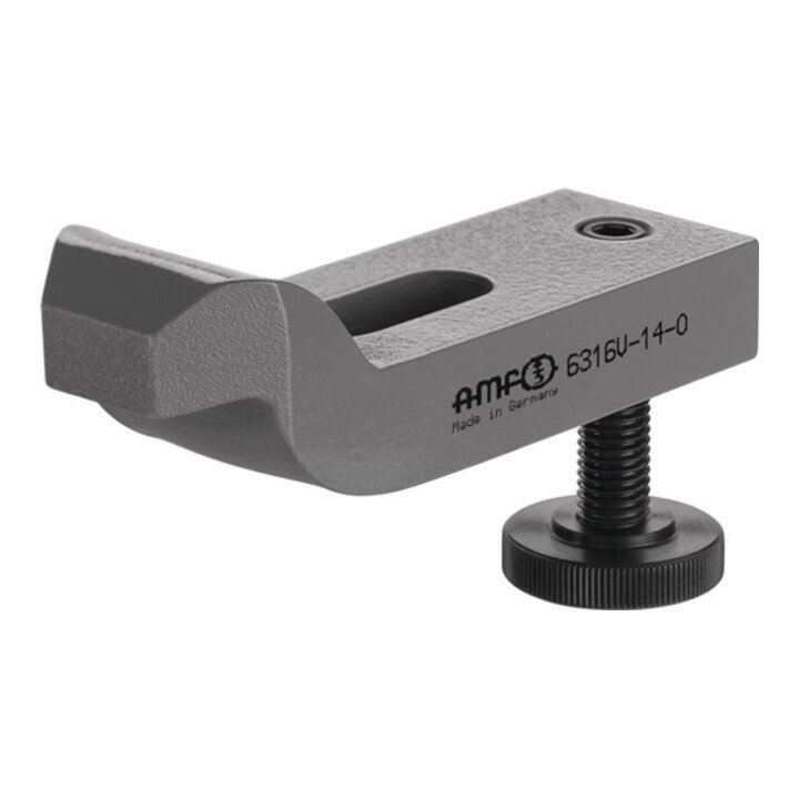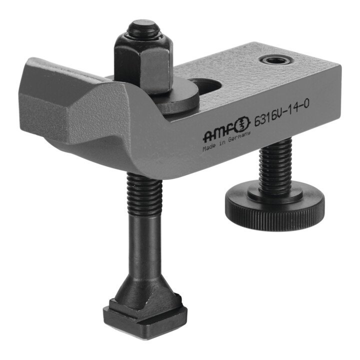 Maß H: Abhängig von Nutentiefe nach DIN 650 sowie Einschraublänge der Mutter. Die niedrigste Spannhöhe wird durch Umdrehen des Spanneisens erreicht.