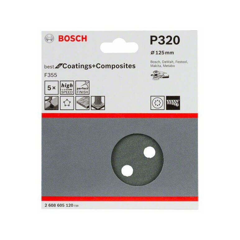 Bosch Schleifblatt F355, 125 mm, 320, 8 Löcher, Klett, 5er-Pack (2 608 605 120)