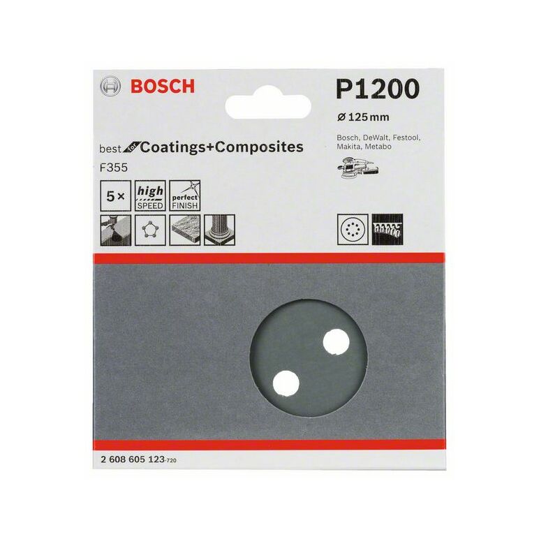 Bosch Schleifblatt F355, 125 mm, 1200, 8 Löcher, Klett, 5er-Pack (2 608 605 123)