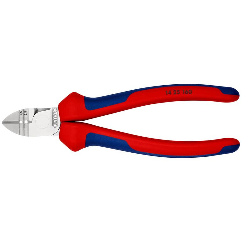 mit langer Schneide. hohe Schneidleistung durch Kraftgelenk. Präzisions-Abisolierlöcher für Leiter 1,5 und 2,5 mm². Komfortables Schneiden von NYM-Kabeln bis 5 x 2,5 mm². Lange Spitzen für feinste Schneidarbeiten auch unter beengten Verhältnissen. Induktiv gehärtete Präzisionsschneiden, Schneidenhärte ca. 60 HRC.