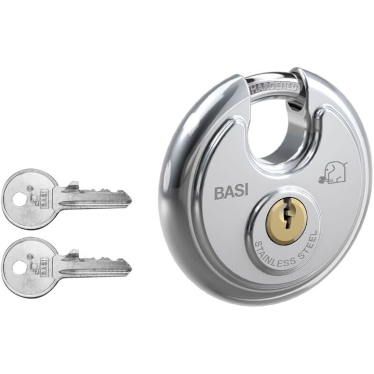 Das Rundbügelschloss der Marke BASI aus hochwertigem Edelstahl bietet höchsten Schutz für Ihr Eigentum. Eignet sich perfekt zum Verschließen von Toren, Anhängern, Auflagenboxen, Kellerräume oder Schränke. Das Vorhangschloss ist mit einem gehärtetem Stahlbügel und einem Kneifschutz ausgestattet. Durch die runde Form des Schlosses bietet das Diskusschloss nur wenig Angriffspunkte und mehr Sicherheit. Dank des Korpus aus Edelstahl ist das Schloss zudem witterungsbeständig und rostfrei. Wahlweise Gleichschließend / Verschiedenschließend – Lieferung inklusive 2 Schlüssel. Rundbügelschloss / Vorhangschloss mit Edelstahlkorpus und Stahlbügel Lieferung inklusive 2 Schlüssel Die Scheibenform sorgt für zusätzlichen Aufbruchsschutz Zum Verschließen von Kellertüren, Tore, Schuppen, Werkzeugen oder als Anhängerschloss verwendbar Maße: A:70 B:17,5 C:9,5 mm