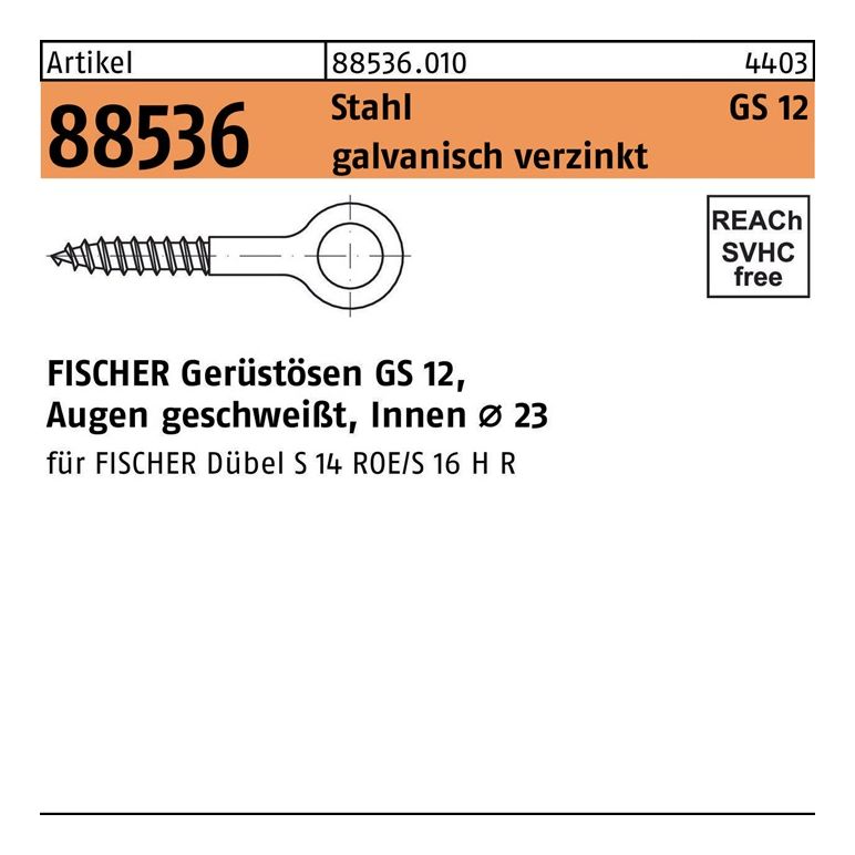 Artikel 88536 Stahl GS 12 galvanisch verzinkt FISCHER Gerüstösen GS 12 · Augen geschweißt · Innen Ø 23 - Abmessung: GS 12 x 300 VE=S (25 Stück)Weitere technische Eigenschaften:· Ausführung: FISCHER Gerüstösen GS 12, Augen geschweißt, Innen Ø 23· Gruppencode 88536.010· Länge 300mm· Normart REYHER-Artikel 88536· Oberfläche galvanisch verzinkt