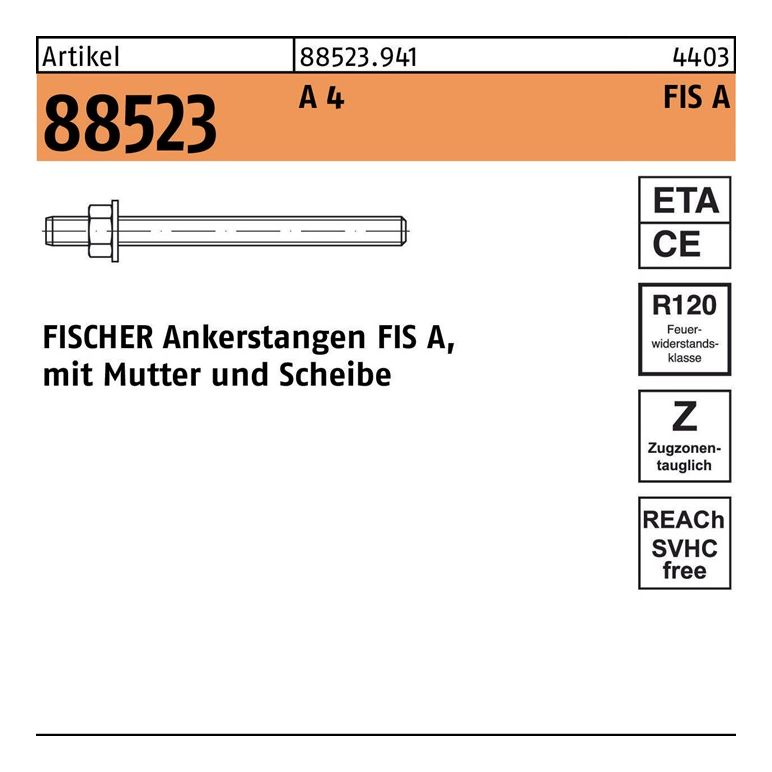 Artikel 88523 A 4 FIS A FISCHER Ankerstangen FIS A · mit Mutter und Scheibe - Abmessung: FIS A M 24x380 VE=S (5 Stück)Weitere technische Eigenschaften:· Ausführung: FISCHER Ankerstangen FIS A, mit Mutter und Scheibe· Werkstoff: A 4· Gruppencode 88523.941· Normart REYHER-Artikel 88523· Oberfläche Ohne Oberflächenangabe