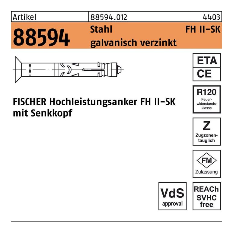 Artikel 88594 Stahl FH II-SK galvanisch verzinkt FISCHER Hochleistungsanker FH II-SK mit Senkkopf - Abmessung: FH II 10/ 25 SK VE=S (50 Stück)Weitere technische Eigenschaften:· Durchmesser 10mm· Gruppencode 88594.012· Länge 25mm· Normart REYHER-Artikel 88594· Oberfläche galvanisch verzinkt