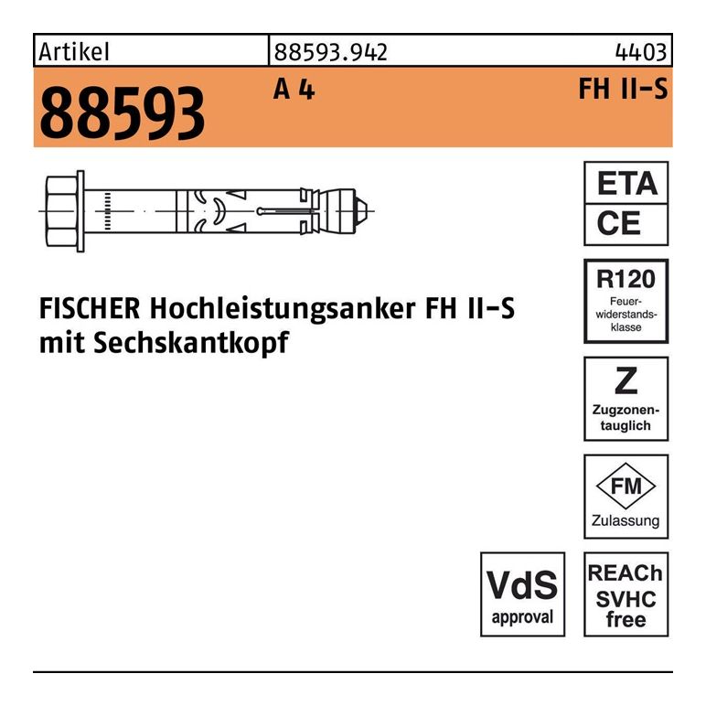 Artikel 88593 A 4 FH II-S FISCHER Hochleistungsanker FH II-S mit Sechskantkopf - Abmessung: FH II 15/ 10 S VE=S (50 Stück)Weitere technische Eigenschaften:· Durchmesser 15mm· Gruppencode 88593.942· Länge 10mm· Normart REYHER-Artikel 88593· Oberfläche Ohne Oberflächenangabe