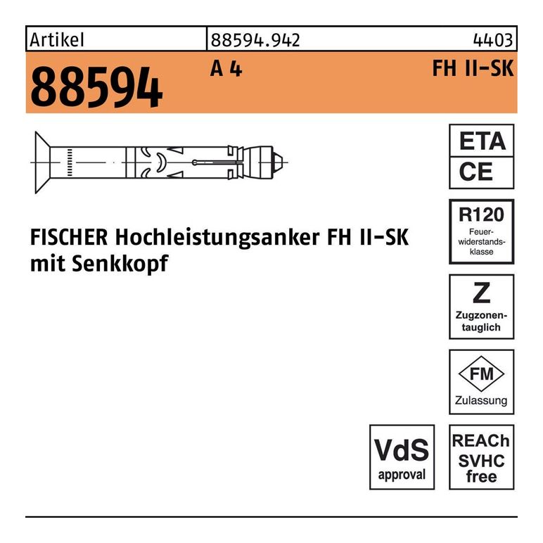 Artikel 88594 A 4 FH II-SK FISCHER Hochleistungsanker FH II-SK mit Senkkopf - Abmessung: FH II 18/ 30 SK VE=S (20 Stück)Weitere technische Eigenschaften:· Durchmesser 18mm· Gruppencode 88594.942· Länge 30mm· Normart REYHER-Artikel 88594· Oberfläche Ohne Oberflächenangabe