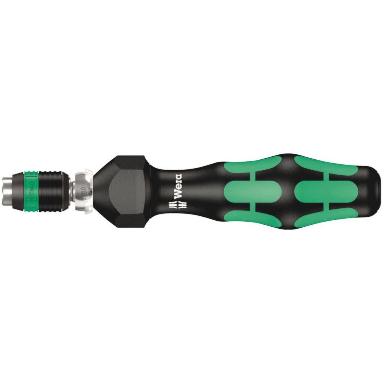 Wera Drehmomentschraubendreher. Variable Drehmomenteinstellung bei höchster Genauigkeit. Einfache Einstellung des benötigten Drehmomentwertes ohne Sonderwerkzeug. Gute Ablesbarkeit des Skalenwerts. Rapidaptor-Schnellwechseltechnologie für blitzschnellen Bit-Wechsel. Unbegrenztes Lösemoment zum Lösen festsitzender Schrauben. Mehrkomponentiger Kraftform-Griff mit Hart- und Weichzonen für hohe Arbeitsgeschwindigkeiten und zur Schonung der Handfläche. Geeignet für Bits mit 1/4"-Außensechskantantrieb nach DIN ISO 1173-C 6,3 und E 6,3 (ISO 1173).