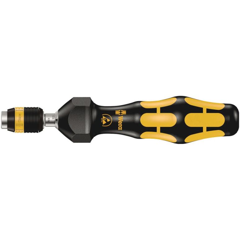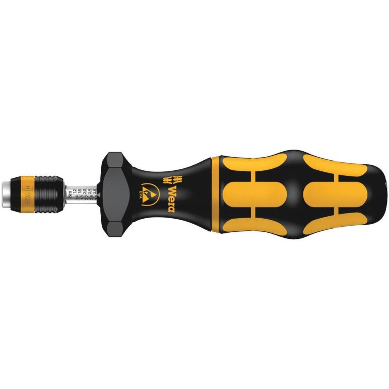 Wera Drehmomentschraubendreher. Sicherer Schutz vor elektrostatischer Energie und damit verbundenen Schäden. Variable Drehmomenteinstellung bei höchster Genauigkeit. Einfache Einstellung des benötigten Drehmomentwertes ohne Sonderwerkzeug. Gute Ablesbarkeit des Skalenwerts. Rapidaptor-Schnellwechseltechnologie für blitzschnellen Bit-Wechsel. Unbegrenztes Lösemoment zum Lösen festsitzender Schrauben. Mehrkomponentiger Kraftform-Griff mit Hart- und Weichzonen für hohe Arbeitsgeschwindigkeiten und zur Schonung der Handfläche. Geeignet für Bits mit 1/4"-Außensechskantantrieb nach DIN ISO 1173-C 6,3 und E 6,3 (ISO 1173).