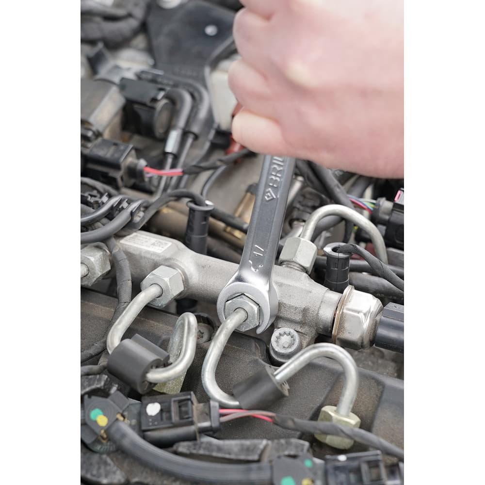 HOHE PASSGENAUIGKEIT: Der 140 mm lange Doppelringschlüssel hat unterschiedliche Schlüsselweiten. Der abgewinkelte 12-kant Ring mit UD-Profil und 15° versetzter Öffnung optimiert die Drehmomentübertragung.