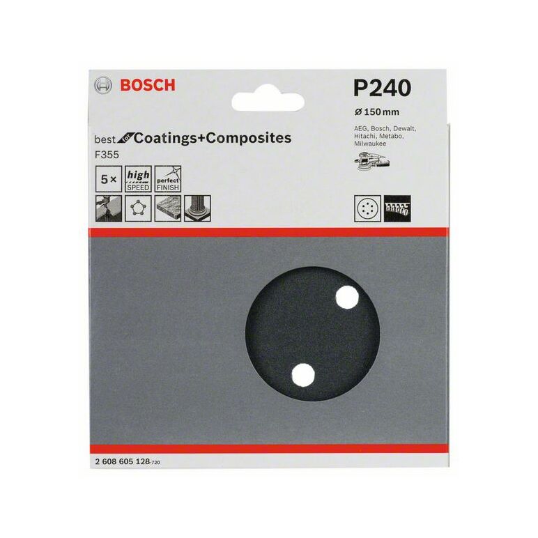 Bosch Schleifblatt F355, 150 mm, 240, 6 Löcher, Klett, 5er-Pack (2 608 605 128)