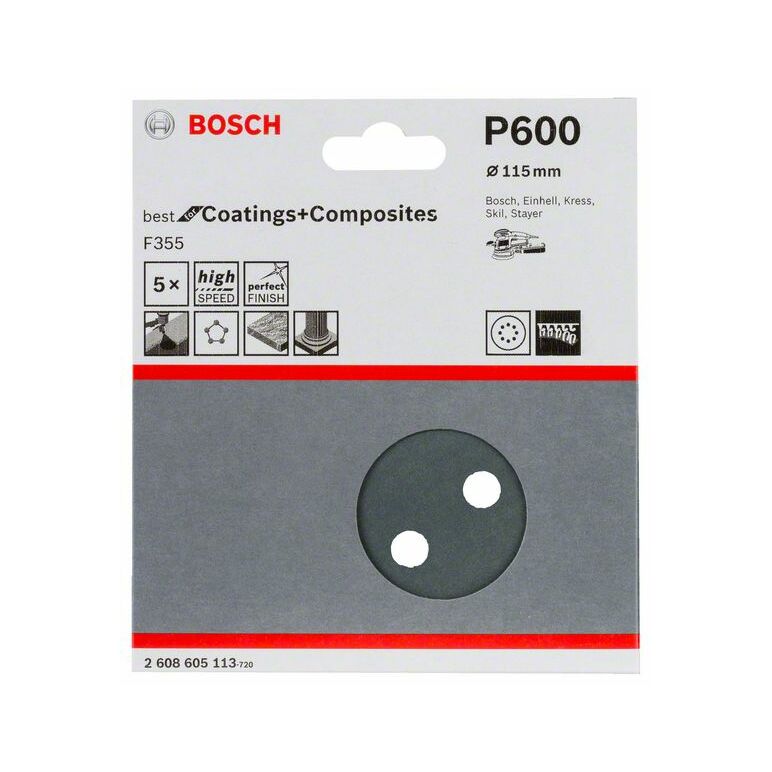 Bosch Schleifblatt F355, 115 mm, 600, 8 Löcher, Klett, 5er-Pack (2 608 605 113)