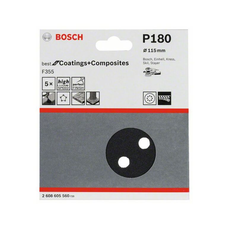 Bosch Schleifblatt F355, 115 mm, 180, 8 Löcher, Klett, 5er-Pack (2 608 605 560)