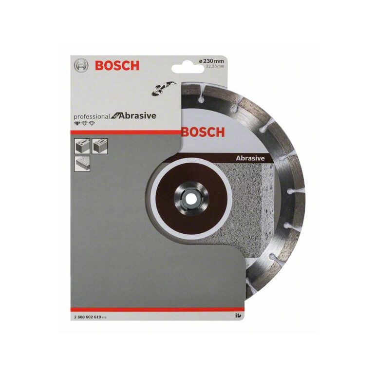 Die Diamanttrennscheibe Standard for Abrasive hat bei Arbeiten mit abrasivem Material aller Art eine hoher Lebensdauer. Die optimierte Diamantmatrix ermöglicht zuverlässige Ergebnisse, denn das Bosch-Kompetenzzentrum Diamant in der Schweiz gewährleistet den hohen Standard der Scheibe. Die Scheibe ist für das Schneiden von abrasivem Material aller Art geeignet. Durchmesser mm: 230, Bohrungsdurchmesser mm: 22,23, Schnittbreite mm: 2,3, Segmenthöhe mm: 10.