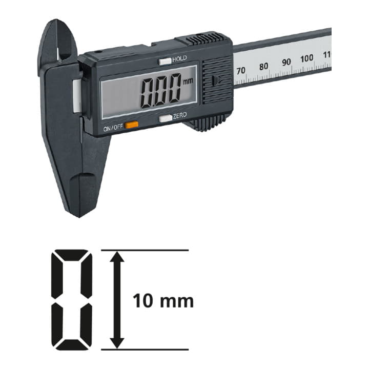 DIGITALE ANZEIGE: Der Messschieber verfügt über eine digitale 30 x 10 mm LCD-Anzeige mit automatischer Abschaltung und PC-Schnitstelle. Die Anzeige können Sie an jeder Position zurücksetzen.