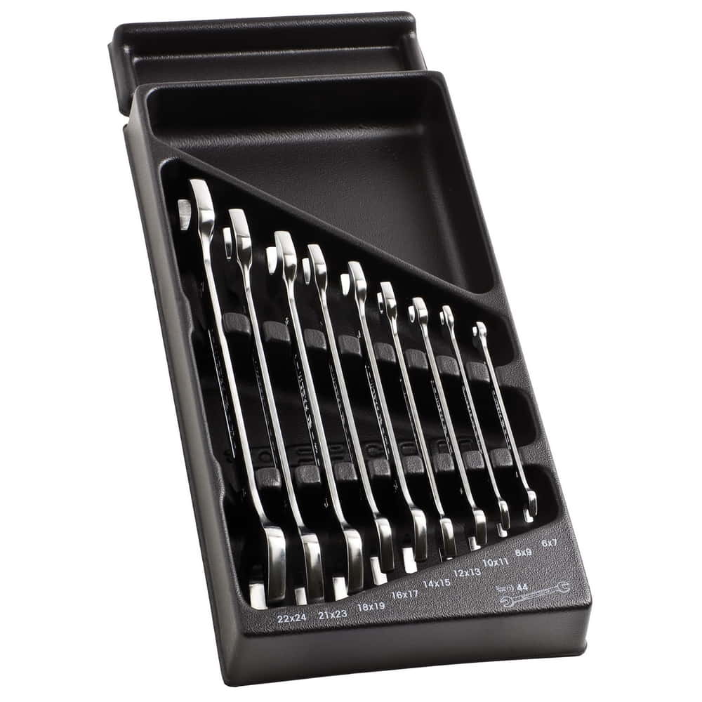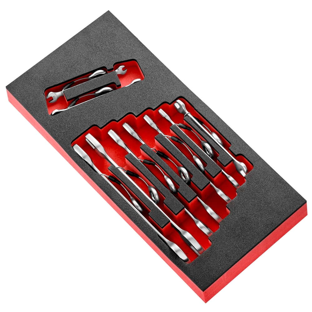 Das Facom 440.JP14 bietet ein praktisches Set mit 14 Ring - Maulschlüsseln und beinhaltet folgende Größen 7 - 8 -10 - 11 - 12 - 13 - 14 - 15 - 16 - 17 - 18 - 19 - 22 - 24 mm. Außerdem ist das Set stoßfest und beständig gegen Chemikalien. Verpackt ist das Set in dem sehr kompakten Facom Etui CK.440J3.