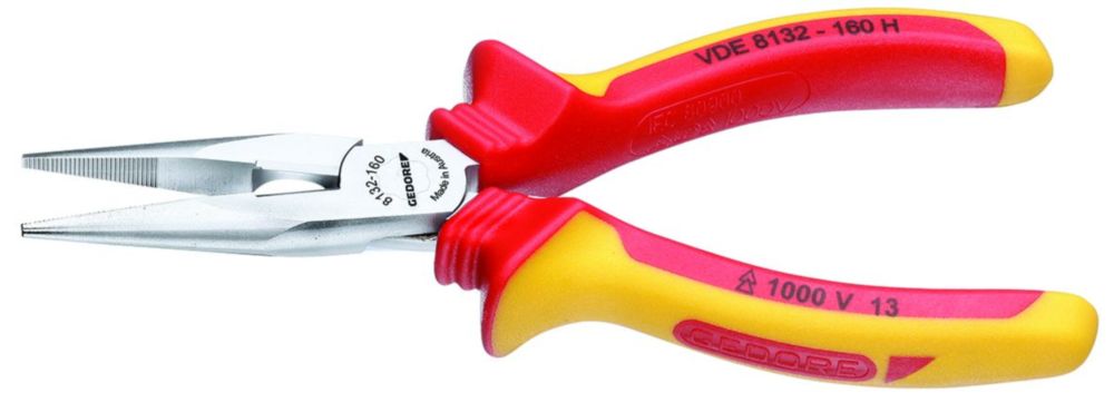 LIEFERUMFANG: 1 x GEDORE VDE-Flachrundzange mit Hüllenisolierung, gerade, Länge: 160 mm, Gewicht: 164 g, Artikelnummer: VDE 8132-160 H