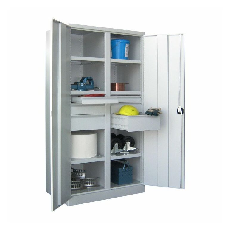 Pavoy Schwerlastschrank, Vollblechtüren, ohne Trennwand, 6 beschichtete Böden, Schubl. 2x75, 2x125, 2x175 mm, BxTxH 1040x630x1950 mm, RAL 7035