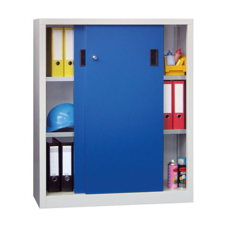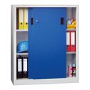 Schiebetürenschrank, Vollblechtüren, 2 verzinkte Böden, ohne Trennwand, BxTxH 1000x400x1200 mm, Korp us RAL 7035/Front RAL 5010 enzianblau