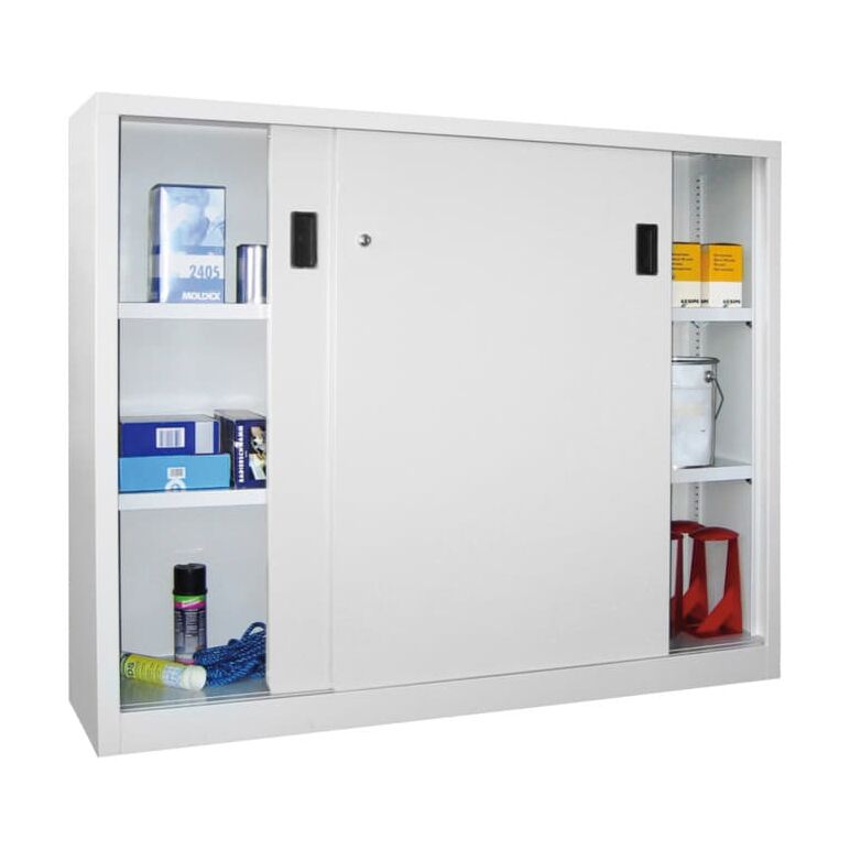 Schiebetürenschrank, Vollblechtüren, 4 verzinkte Böden, mit Trennwand, BxTxH 1500x400x1200 mm, Korpu s und Front RAL 7035 lichtgrau