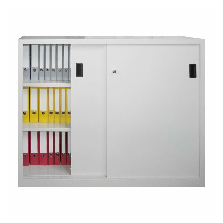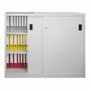 Schiebetürenschrank, Vollblechtüren, 4 verzinkte Böden, mit Trennwand, BxTxH 1500x600x1200 mm, Korpu s und Front RAL 7035 lichtgrau