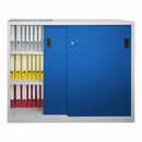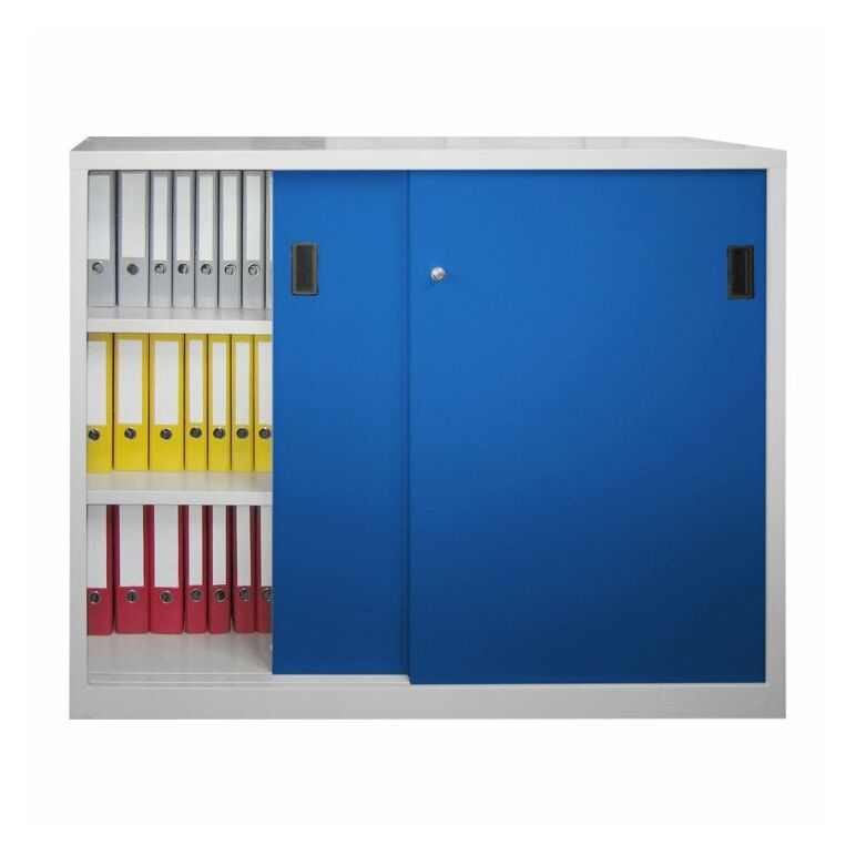 Schiebetürenschrank, Vollblechtüren, 4 verzinkte Böden, mit Trennwand, BxTxH 1500x600x1200 mm, Korpu s RAL 7035/Front RAL 5010 enzianblau
