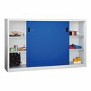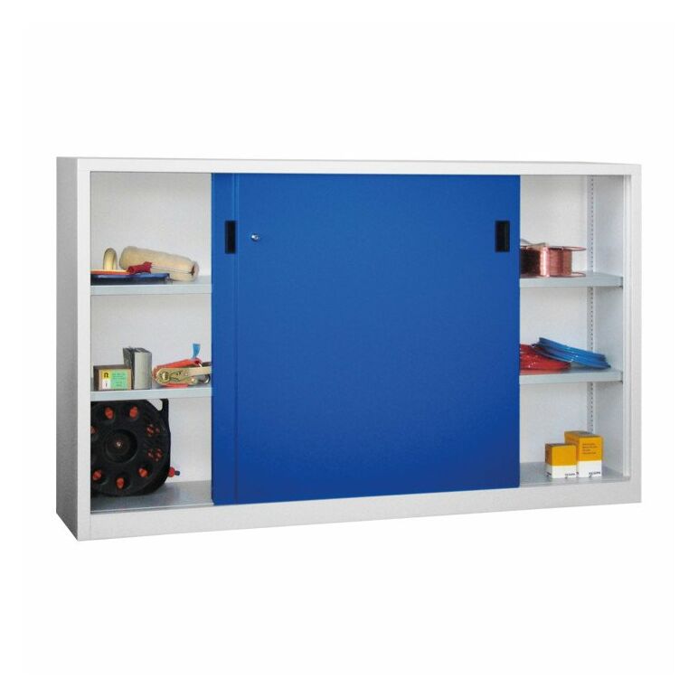 Schiebetürenschrank, Vollblechtüren, 4 verzinkte Böden, mit Trennwand, BxTxH 2000x400x1200 mm, Korpu s RAL 7035/Front RAL 5010 enzianblau