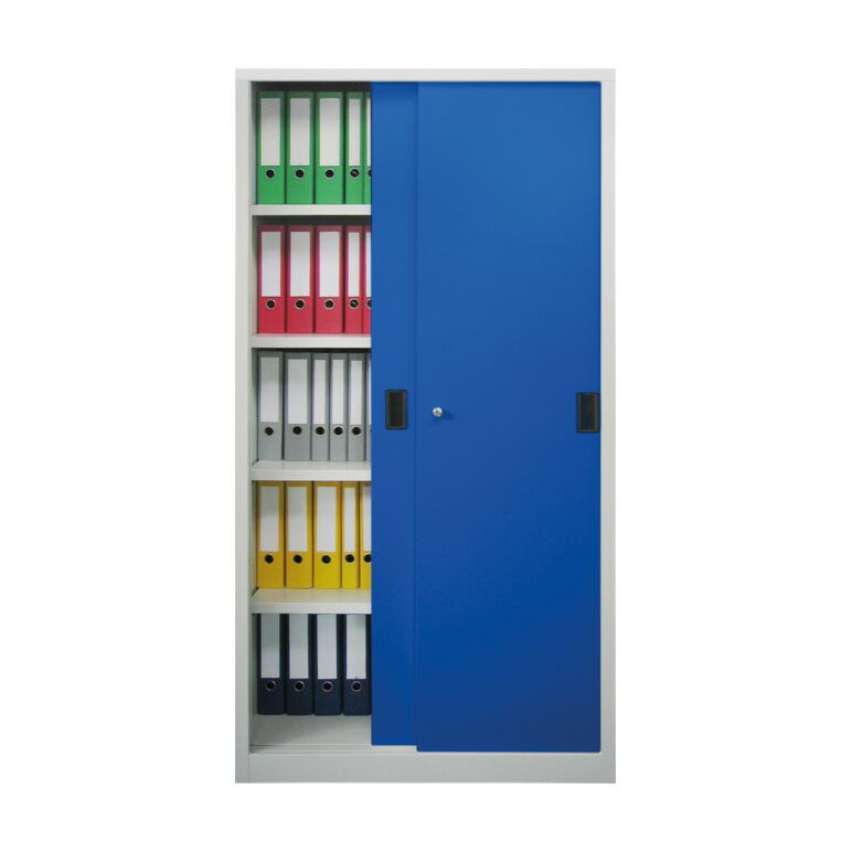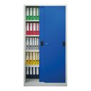 Schiebetürenschrank, Vollblechtüren, 4 verzinkte Böden, ohne Trennwand, BxTxH 1000x500x1950 mm, Korp us RAL 7035/Front RAL 5010 enzianblau