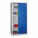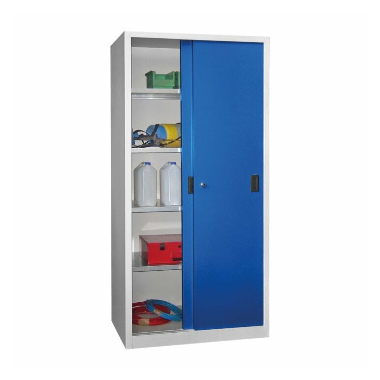 Schiebetürenschrank, Vollblechtüren, 4 verzinkte Böden, ohne Trennwand, BxTxH 1000x600x1950 mm, Korp us RAL 7035/Front RAL 5010 enzianblau