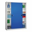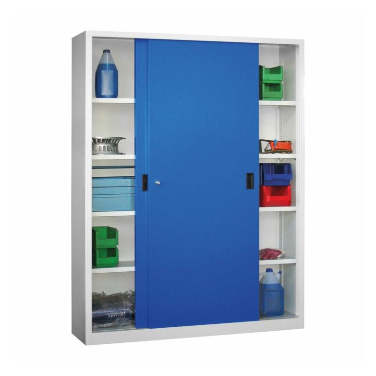 Schiebetürenschrank, Vollblechtüren, 8 verzinkte Böden, mit Trennwand, BxTxH 1500x400x1950 mm, Korpu s RAL 7035/Front RAL 5010 enzianblau