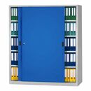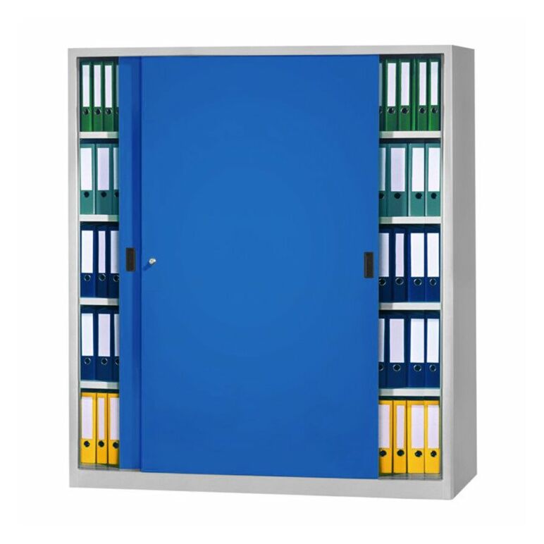 Schiebetürenschrank, Vollblechtüren, 8 verzinkte Böden, mit Trennwand, BxTxH 2000x400x1950 mm, Korpu s RAL 7035/Front RAL 5010 enzianblau