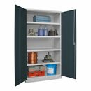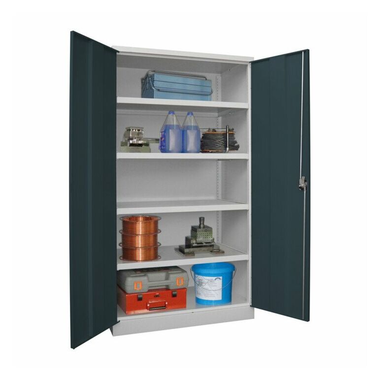 - 4 gepulverte Fachböden a 200 kg Tragkraft (25 mm höhenverstellbar)