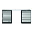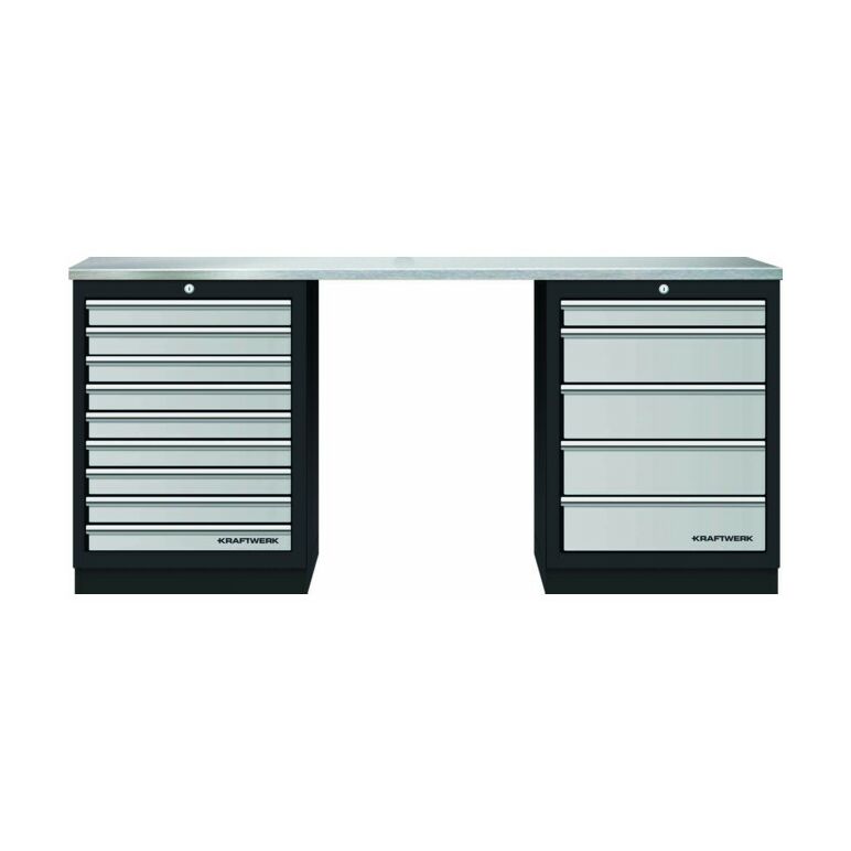 • Der Arbeitsplatzbereich ist mit einer durchgängigen 38 mm starken Edelstahl 430 Arbeitsplatte ausgestattet. 1 Arbeitsplatzschrank mit 5 Schubladen.1 Arbeitsplatzschrank mit 9 Schubladen.1 x freibleibend als Arbeitsplatz