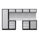- Der Arbeitsplatzbereich ist mit zwei 38 mm starken Edelstahl Arbeitsplatten ausgestattet.1 Arbeitsplatzschrank mit 5 Schubladen.1 Arbeitsplatzschrank mit 9 Schubladen