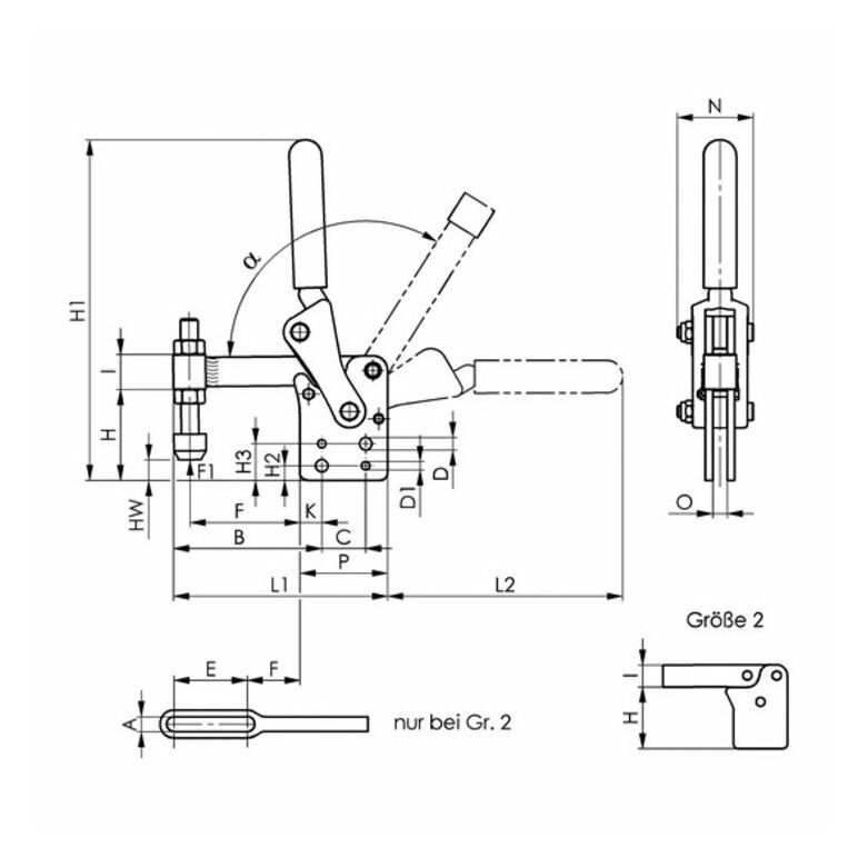 schwer · mit senkrechtem Fuß und Anschraublöchern · geriebene und einsatzgehärtete Lagerbuchsen · gehärtete, geschliffene und dauerhaft gefettete Bolzen · Klemmmutter am Hebelarm für einstellbare Gängigkeit · Werkstoff: Stahl, brüniert · Hebelarm aus Stahlguss, brüniert Weitere technische Eigenschaften: · A: 6,2mm · L2: 94mm · HW min.: 3,5mm · L1: 85mm · HW max.: 22,8mm · H1: 144mm · F1: 2,5kN · O: 6mm · a*: 190° · I: 15mm · F: 12mm · B: 48mm · P: 37mm · Eigenschaft: schwer · E: 30mm · H: 42mm · N: 31mm · Spannweite: 30 mm