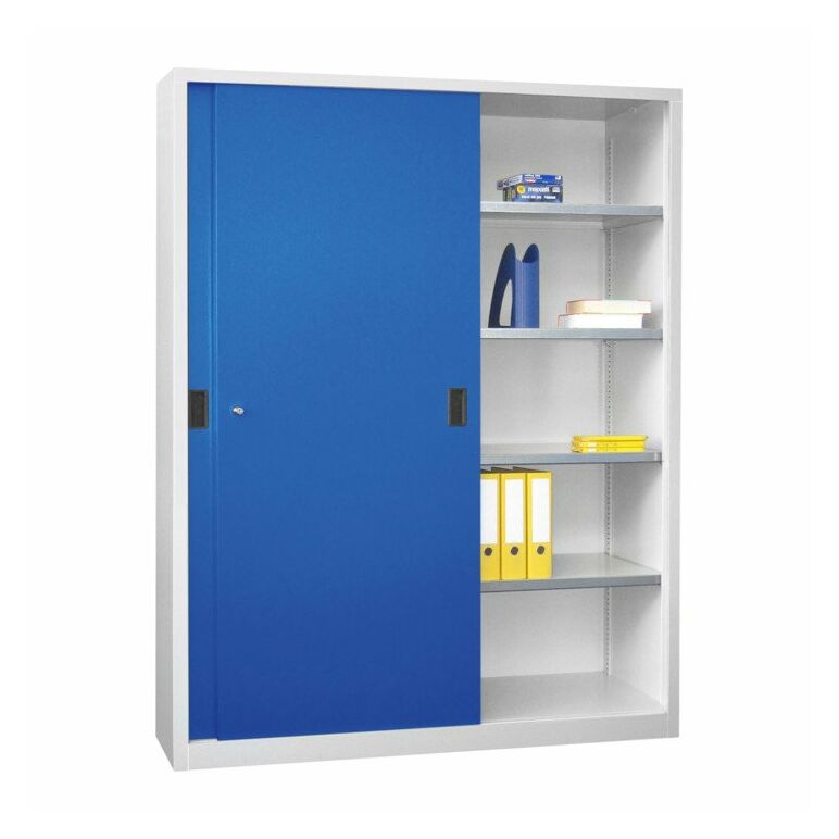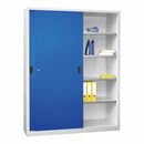 Schiebetürenschrank, Vollblechtüren, 8 verzinkte Böden, mit Trennwand, BxTxH 1500x600x1950 mm, Korpu s RAL 7035/Front RAL 5010 enzianblau