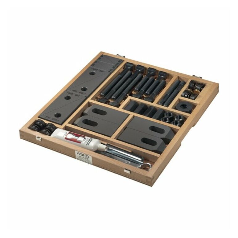 mit federndem Spanneisenhalter · enthält alle notwendigen Elemente zum schnellen Aufspannen von Werkzeugen, Vorrichtungen oder Werkstücken auf T-Nutentischen · alle Teile sind aus Vergütungsstahl, sie sind auswechselbar und können jederzeit ersetzt werden · die Lieferung erfolgt im Holzkasten mit abnehmbarem Klappdeckel Weitere technische Eigenschaften: · Inhalt: 44 teilig · Sechskantmuttern: 4 x M20 · Universalspannunterlagen: 4 x Gr. 2, 4 x Gr. 3 · Schraubenpaste: ja · Ringmaulschlüssel: 1 x Gr. 18 x 18mm · Verlängerungsmuttern: 4 x M20 · Federnde Spanneisenhalter: 4 x Gr. 2 · Spanneisen mit Treppenzähnen: 4 x Gr. 14 x 100mm · Kegelpfannen Form: G 6 x M20 · Nutenräumer: -