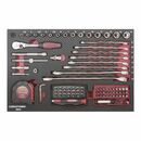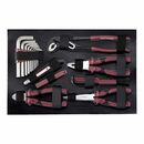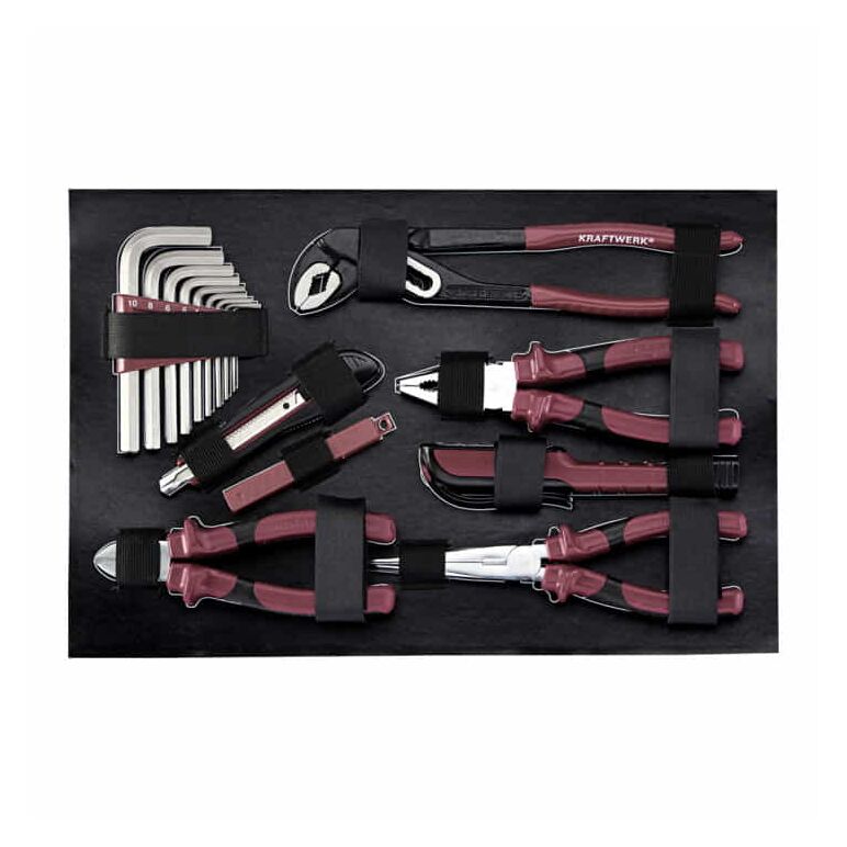 - Die Werkzeuge sind in speziell hochverdichteten Weich-Schaumstoff-Einlagen (EVA) mit einer dauerhaften und leicht zu reinigenden Hartplastik-Oberschicht passgenau eingebettet bzw. sicher durch Taschen und Bänder auf den Werkzeugtafeln und im Kofferdeckel verstaut